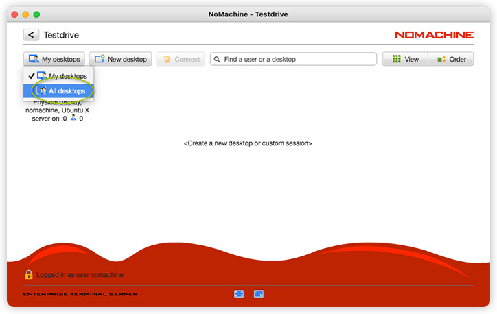 NoMachine terminal servers like Workstation, Small Business Server, Terminal Server and Enterprise Terminal Server + Terminal Server Nodes are tailored for providing users with personal desktops, named NoMachine virtual desktops or allow them to run single Linux applications (custom sessions). For those Linux environments requesting to give access only to the remote physical desktop, the NoMachine Enterprise Desktop is the most suitable solution.