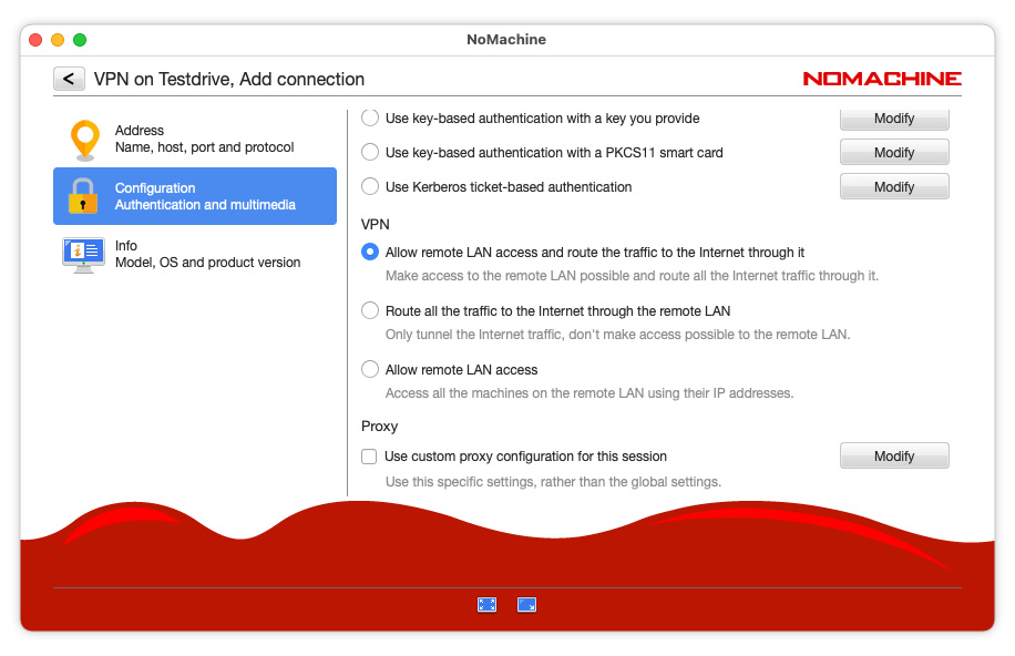 You won’t be able to access other machines on the remote LAN with their internal IP address other than the NoMachine server host to which you're connected by the NoMachine VPN. This works like other VPN service providers, with the difference that it’s the self-hosted NoMachine server installed on premises that provides the VPN, not an external third party service. All local incoming and outgoing Internet traffic (e.g. browser navigation, remote video playing etc) is encapsulated and routed through the NoMachine VPN-enabled server. Your real IP address, from which you started the VPN, will not be shown.
