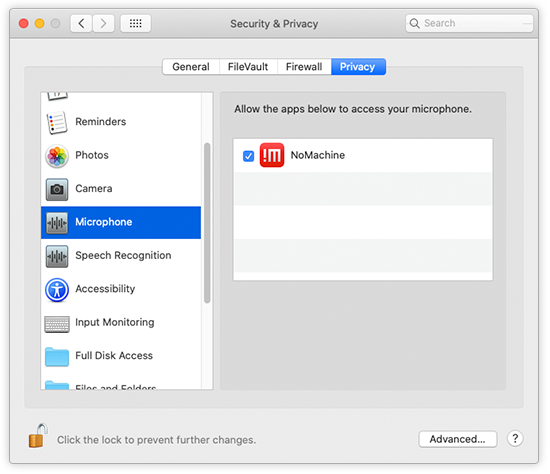 If you didn't accept to grant accessibility permissions to NoMachine upon system dialog requests, you can add them later manually via the System Preference panel as explained above. To grant audio support, when access to microphone is not given via system dialog, enable NoMachine in the list of applications which have access to microphone (System Preferences -> Privacy -> Microphone).