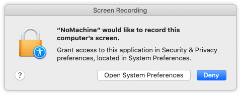 Then add 'NoMachine' to Screen Recording: a system dialog is issued to grant access to 'NoMachine' to screen recording functionalities. Click on 'Open System Preferences':