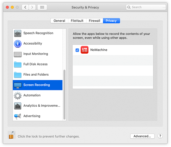 and allow 'NoMachine' to record the content of your screen: