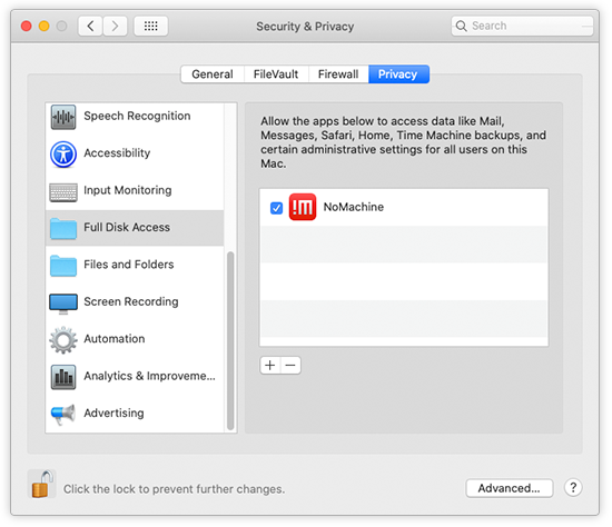It's also possible to grant 'NoMachine' with 'Full Disk Access permission' by editing the system settings: Open Settings -> Security & Privacy -> Privacy group and select Full Disk Access permission. Add NoMachine to the list of allowed applications for Full Disk Access.