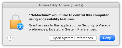 When installing NoMachine on Catalina a system dialog is issued for the Accessibility Access (Events). If you're administrator, grant access to 'nomachine' by clicking on 'Open System Preferences':