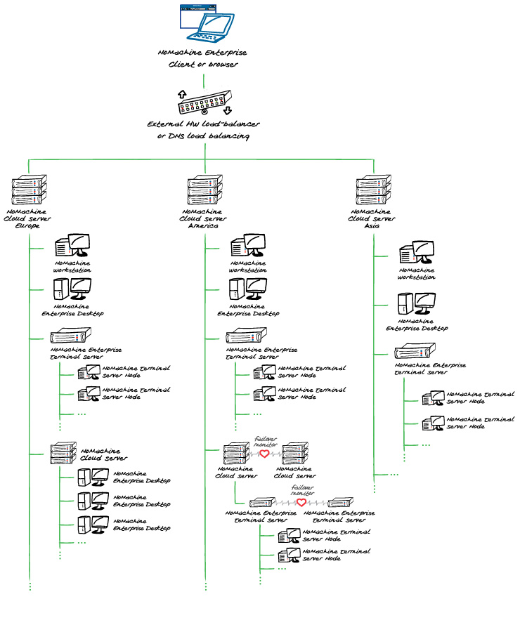 Adopting an external load-balancing device or service enables i) balancing of traffic among multiple NoMachine Cloud Servers, which are all at the same level in the hierarchical infrastructure and independent from one another and ii) the routing of users to a specific Cloud Server according to the user's geographical location.