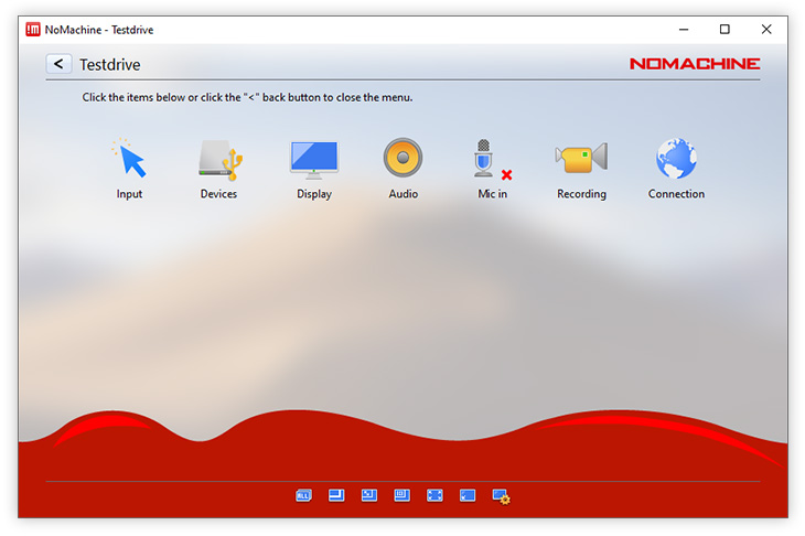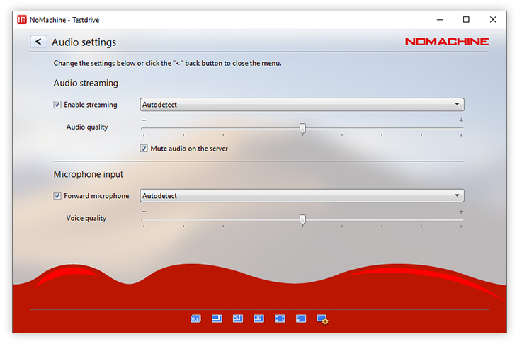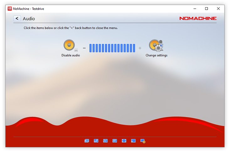 Enable louder (more blue bars) or lower (fewer blue bars) audio volume. NoMachine automatically detects the audio settings on the remote host to work out-of-the-box. Audio is enabled by default and can be disabled by clicking on the left of the volume slider. Disabling audio will mean you don't hear sound in your session, sound will continue to be heard on the remote host if it is enabled.