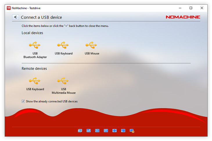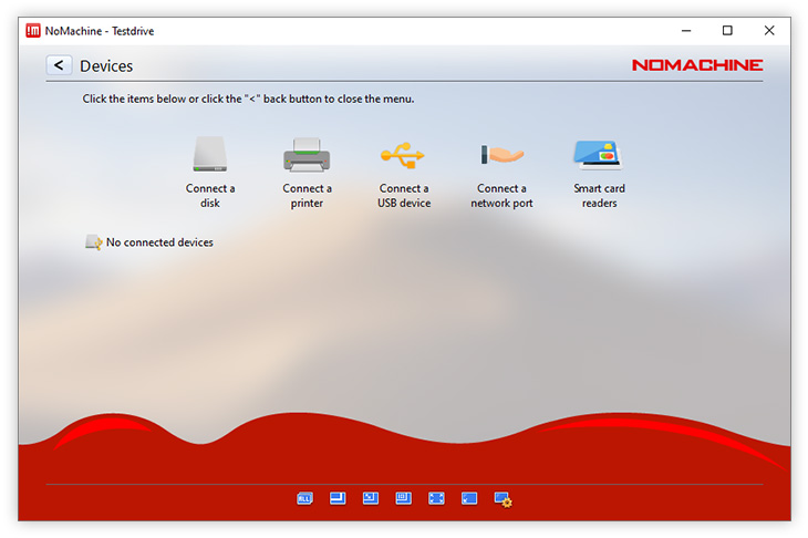 The first time you want to use any of the following in your session: printers, disks, USB devices, network ports and smart card readers you must connect the device first, after which that device will always be available in your session until you 'Disconnect' it. Devices can be connected both ways i.e from the local machine to the remote computer and vice-versa.