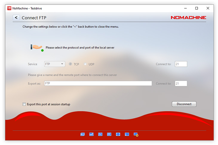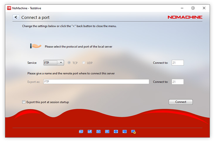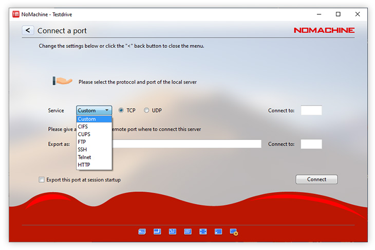 Import or export a custom network port such as TCP or UDP. For example, to export a service from the local PC that uses UDP to communicate (e.g. DNS, VoIP), choose the UDP option in the NoMachine UI. The protocol selected must be consistent with the one required by the service specification.