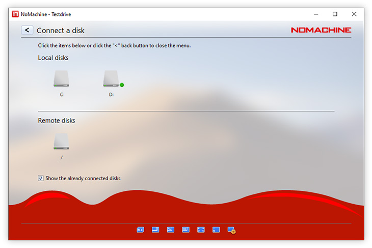 Choose this option if you want to make disk folders and their content available from local to remote or from remote to local. By connecting a local disk, you will be exporting the folder to the remote desktop. By connecting a remote disk, you will be importing to the local desktop. Provided the session is running, you will be able to copy files by dragging from the respective folder you just connected on to the desktop you are working on. E.g., if you just imported a remote folder to your local desktop, open the folder and drag the files outside the folder in order to copy them. For file-transfer between desktops, please consult section dedicated to The Monitor.