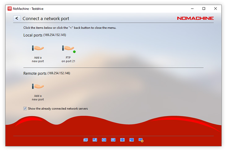 For example, an FTP server set up on a host may only be usable on the LAN at an organization and you therefore can't use it from outside the company network. Additionally, the fact that FTP is not encrypted can raise concerns. Connecting from an FTP client to the FTP server will be insecure or simply be blocked. Via NoMachine's Network Ports, you can establish a connection to the remote server and forward the FTP port from there to the local computer. NoMachine will create an IP for the user (for example, Fig. 12) and display it in the UI panel once connected. The user will be able to connect from their FTP local client using the IP and port, and all file transfers and other operations will be transmitted to the FTP server using a secure and encrypted NoMachine transport tunnel.
