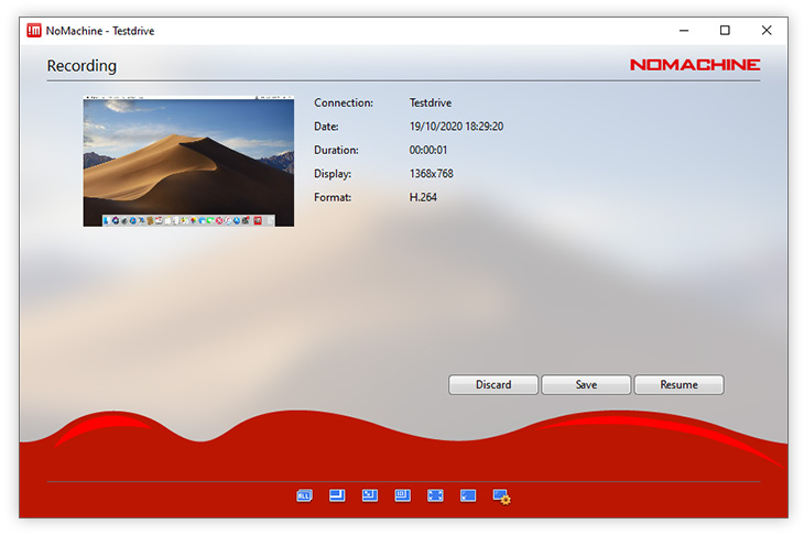 Clicking Stop in the recording bar will prompt NoMachine to ask you whether to discard, save or resume. Save a recording will save it to your local NoMachine folder. To start again without saving, select Discard. To continue with your recording, click Resume.