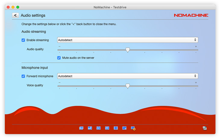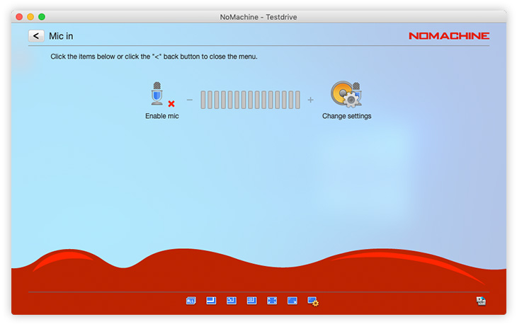 Enable louder (more blue bars) or lower (fewer blue bars) audio volume. NoMachine automatically detects the audio settings on the remote host to work out-of-the-box. Audio is enabled by default and can be disabled by clicking on the left of the volume slider. Disabling audio will mean you don't hear sound in your session, sound will continue to be heard on the remote host if it is enabled.