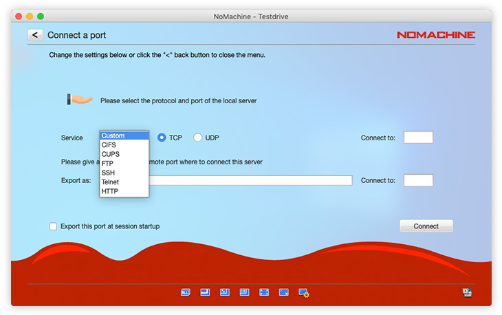 A predefined list of protocols used by the most popular network services such as CUPS, HTTP, FTP, SSH is available in the drop down list. You can also specify a custom port which will be forwarded and made available on the remote host just as if you were using it locally. By selecting a network service, NX will open an encrypted subnet circuit between the client computer and the server installed and will safely traverse firewalls that prohibit or filter certain services over specific ports.