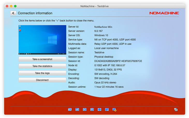Find out basic information about your remote session, including NoMachine software product & versions, server name, IP address, user name, session name, how long the session has been connected, and more.