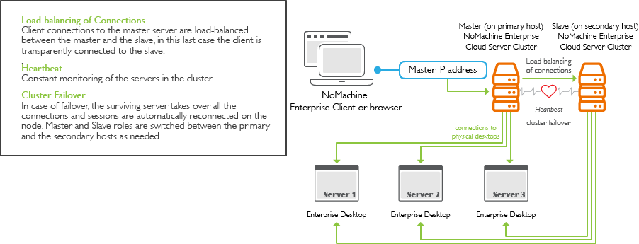• For high-available (HA) access, an Enterprise Cloud Server Cluster (ECSC) set-up in a NoMachine failover cluster (2 x servers, each with a license for ECSC)
