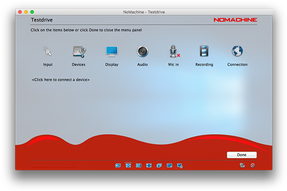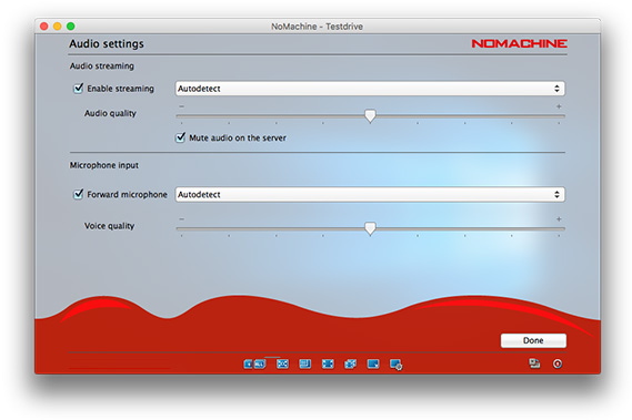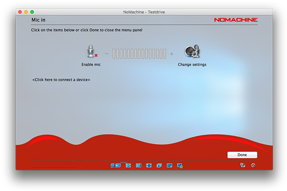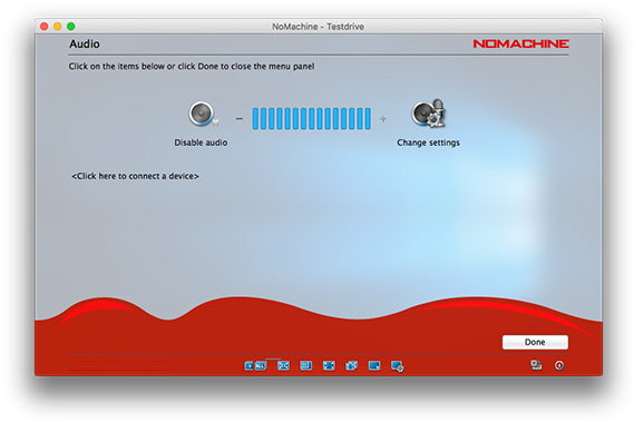 Enable louder (more blue bars) or lower (fewer blue bars) audio volume. NoMachine automatically detects the audio settings on the remote host to work out-of-the-box. Audio is enabled by default and can be disabled by clicking on the left of the volume slider. Disabling audio will mean you don't hear sound in your session, sound will continue to be heard on the remote host if it is enabled.