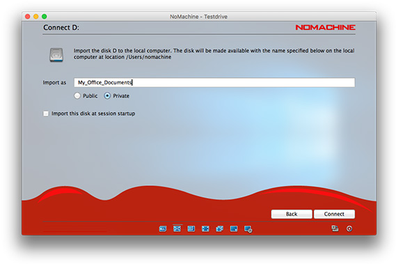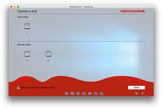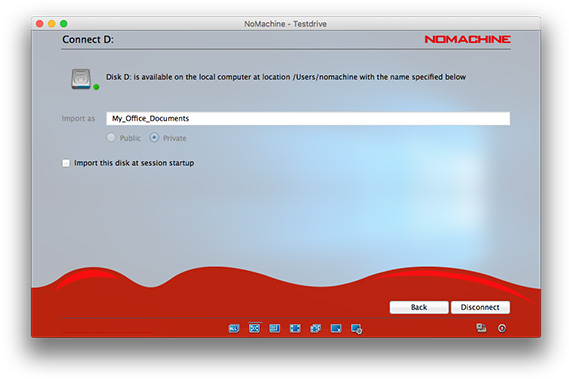 Choose this option if you want to make disk folders and their content available from local to remote or from remote to local. By connecting a local disk, you will be exporting the folder to the remote desktop. By connecting a remote disk, you will be importing to the local desktop. Provided the session is running, you will be able to copy files by dragging from the respective folder you just connected on to the desktop you are working on. E.g., if you just imported a remote folder to your local desktop, open the folder and drag the files outside the folder in order to copy them. For file-transfer between desktops, please consult section dedicated to The Monitor.