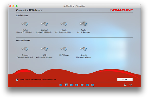 The first time you want to use any of the following in your session: printers, disks, USB devices, network ports and smart card readers you must connect the device first, after which that device will always be available in your session until you 'Disconnect' it. Devices can be connected both ways i.e from the local machine to the remote computer and vice-versa.