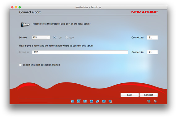 Import or export a custom network port such as TCP or UDP. For example, to export a service from the local PC that uses UDP to communicate (e.g. DNS, VoIP), choose the UDP option in the NoMachine GUI. The protocol selected must be consistent with the one required by the service specification.