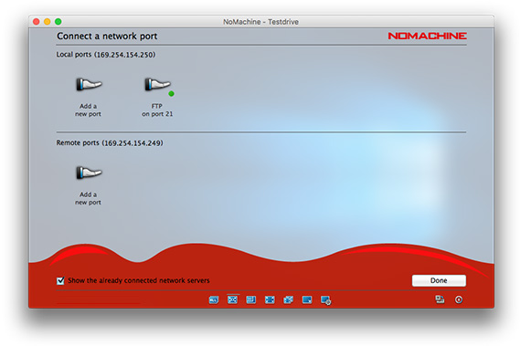 For example, an FTP server set up on a host may only be usable on the LAN at an organization and you therefore can't use it from outside the company network. Additionally, the fact that FTP is not encrypted can raise concerns. Connecting from an FTP client to the FTP server will be insecure or simply be blocked. Via NoMachine's Network Ports, you can establish a connection to the remote server and forward the FTP port from there to the local computer. NoMachine will create an IP for the user (for example, Fig. 12) and display it in the GUI panel once connected. The user will be able to connect from their FTP local client using the IP and port, and all file transfers and other operations will be transmitted to the FTP server using a secure and encrypted NoMachine transport tunnel.