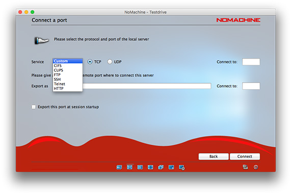 A predefined list of protocols used by the most popular network services such as CUPS, HTTP, FTP, SSH is available in the drop down list. You can also specify a custom port which will be forwarded and made available on the remote host just as if you were using it locally. By selecting a network service, NX will open an encrypted subnet circuit between the client computer and the server installed and will safely traverse firewalls that prohibit or filter certain services over specific ports.