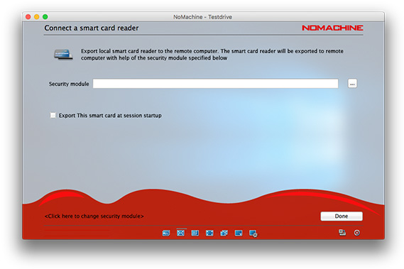 This service will make a smart card reader attached to the client (player) machine available on the server machine. Any application on the server that supports smart cards can be used just as if the reader was attached to the server machine. For example, a user can use the key stored on the card to authenticate to a server somewhere, or use it to digitally sign a document or e-mail. It is necessary to provide the path to NoMachine's libpkcs11.so library, where normally you would provide the path to your standard libopensc library.