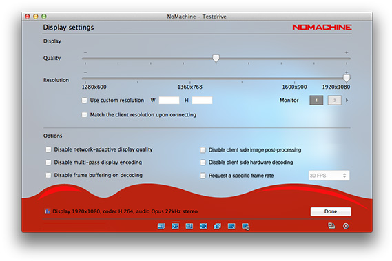 If any of the resolution options indicated don't suit your requirements, you can specify a custom width and height, and NoMachine will try to match it based on the server side hardware. (Note: Custom resolution is better suited for sessions connecting to virtual desktop sessions, rather than physical desktop sessions.) These settings are applied to the monitor highlighted in 'Monitor'.