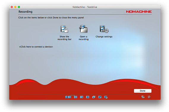 Record the content of the remote window whether it's a video/audio stream, or any other activity within an application on the desktop. Useful for creating presentations, making how-tos, or even capturing an annoying bug. The clips are saved on the local device you are connecting from in the NoMachine folder and can be opened using any player with WebM support or the NoMachine player itself.
