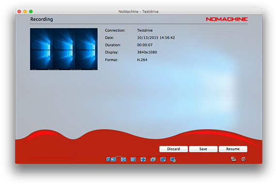 Clicking Stop in the recording bar will prompt NoMachine to ask you whether to discard, save or resume. Save a recording will save it to your local NoMachine folder. To start again without saving, select Discard. To continue with your recording, click Resume.
