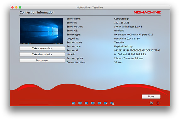 Find out basic information about your remote session, including NoMachine software product & versions, server name, IP address, user name, session name, how long the session has been connected, and more.