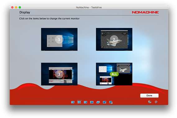 This icon appears when multi-displays are detected on the remote side (physical desktops only). Let users switch between applications which are running on different monitors. When connecting to the remote desktop, NoMachine detects that there are multi-monitors and will show the number accordingly. The keyboard short cut Ctrl-Alt-I is available to quickly identify which monitor is being viewed.