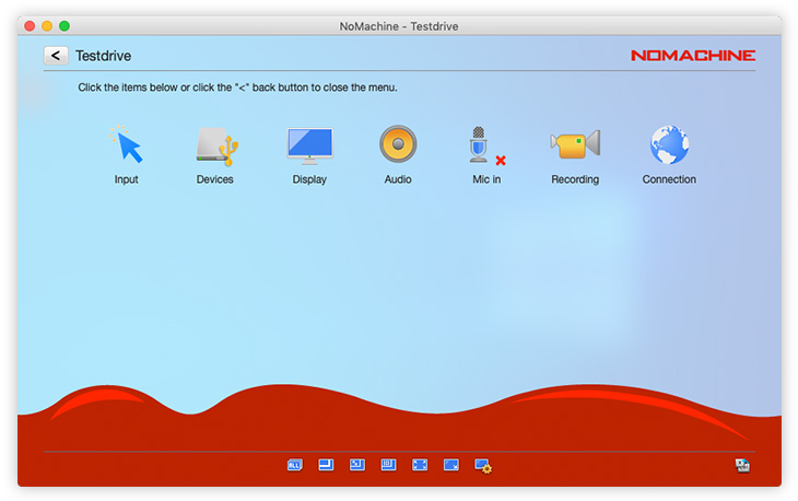 Enable louder (more blue bars) or lower (fewer blue bars) audio volume. NoMachine automatically detects the audio settings on the remote host to work out-of-the-box. Audio is enabled by default and can be disabled by clicking on the left of the volume slider. Disabling audio will mean you don't hear sound in your session, sound will continue to be heard on the remote host if it is enabled.