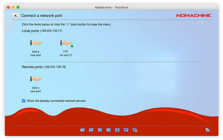 For example, an FTP server set up on a host may only be usable on the LAN at an organization and you therefore can't use it from outside the company network. Additionally, the fact that FTP is not encrypted can raise concerns. Connecting from an FTP client to the FTP server will be insecure or simply be blocked. Via NoMachine's Network Ports, you can establish a connection to the remote server and forward the FTP port from there to the local computer. NoMachine will create an IP for the user (for example, Fig. 12) and display it in the UI panel once connected. The user will be able to connect from their FTP local client using the IP and port, and all file transfers and other operations will be transmitted to the FTP server using a secure and encrypted NoMachine transport tunnel.