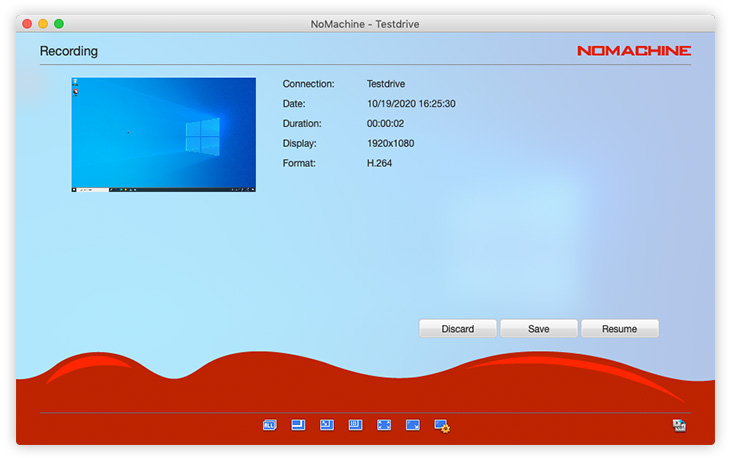 Clicking Stop in the recording bar will prompt NoMachine to ask you whether to discard, save or resume. Save a recording will save it to your local NoMachine folder. To start again without saving, select Discard. To continue with your recording, click Resume.