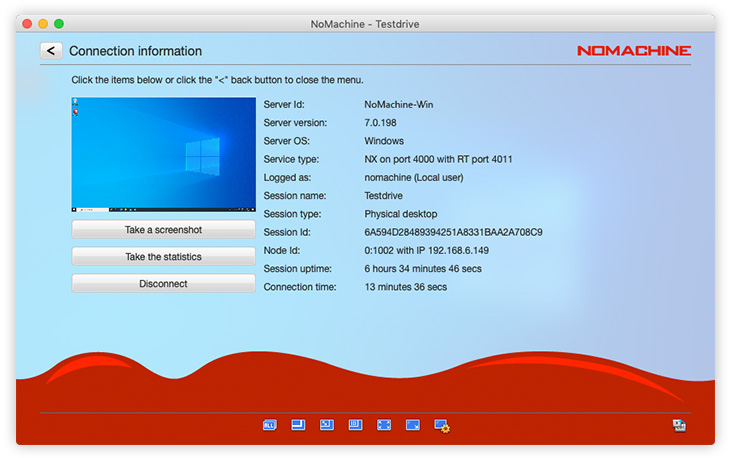 Find out basic information about your remote session, including NoMachine software product & versions, server name, IP address, user name, session name, how long the session has been connected, and more.