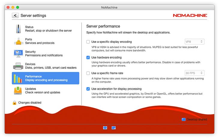 The NoMachine Server interface is made of six tabs to switch about the available configuration panels: Status, Ports, Security, Devices, Performance and Updates.